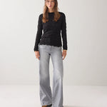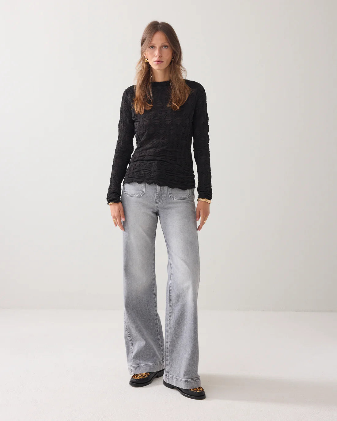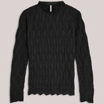 Top van een rekbare, transparante jersey uitgevoerd in een ruitjespatroon. De top heeft lange mouwen, een ronde hals en een aangesloten pasvorm. Alle zomen zijn afgewerkt met fijne babylock-stiksels. De top is mooi te combineren met een blazer, gilet of op een stijlvolle jeans.