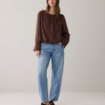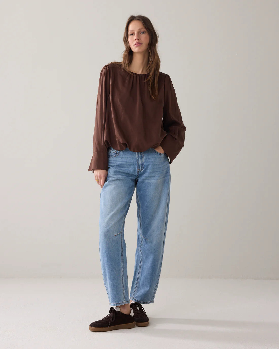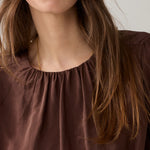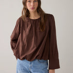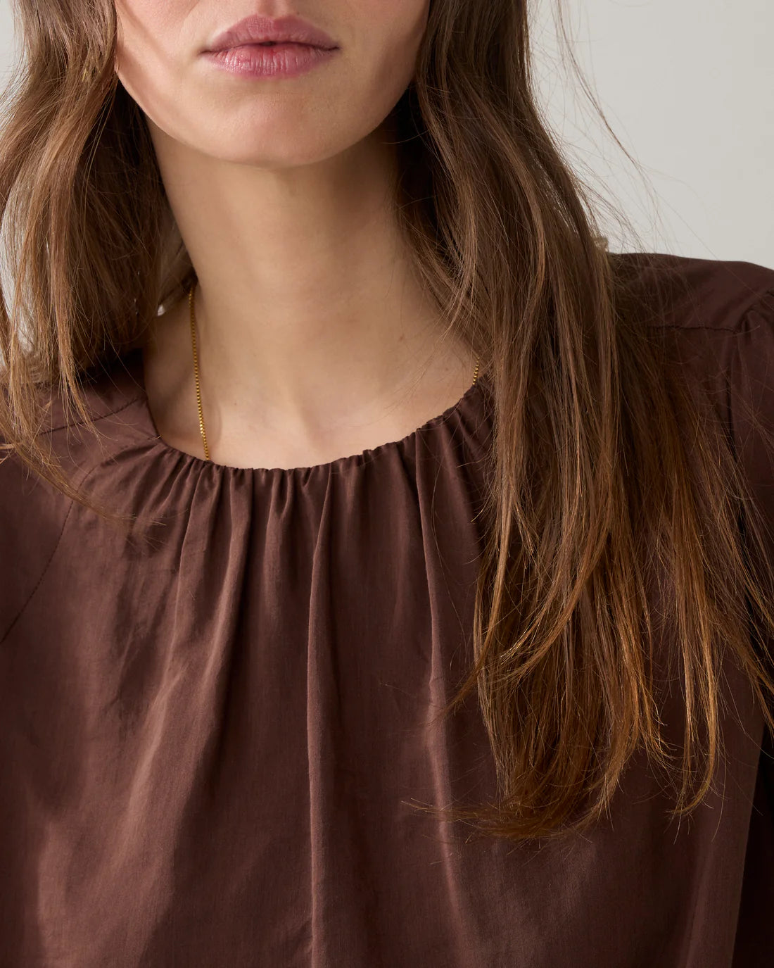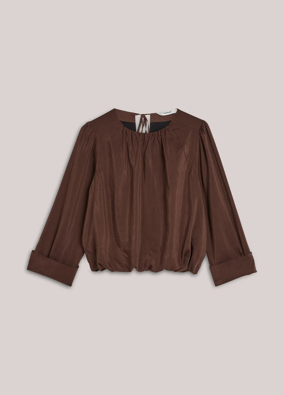 Gevoerde, lichtglanzende top met een aangerimpelde halslijn en zoom. De top heeft nonchalante ballonmouwen met brede manchetten met split en een stoffen striksluiting in de nek.