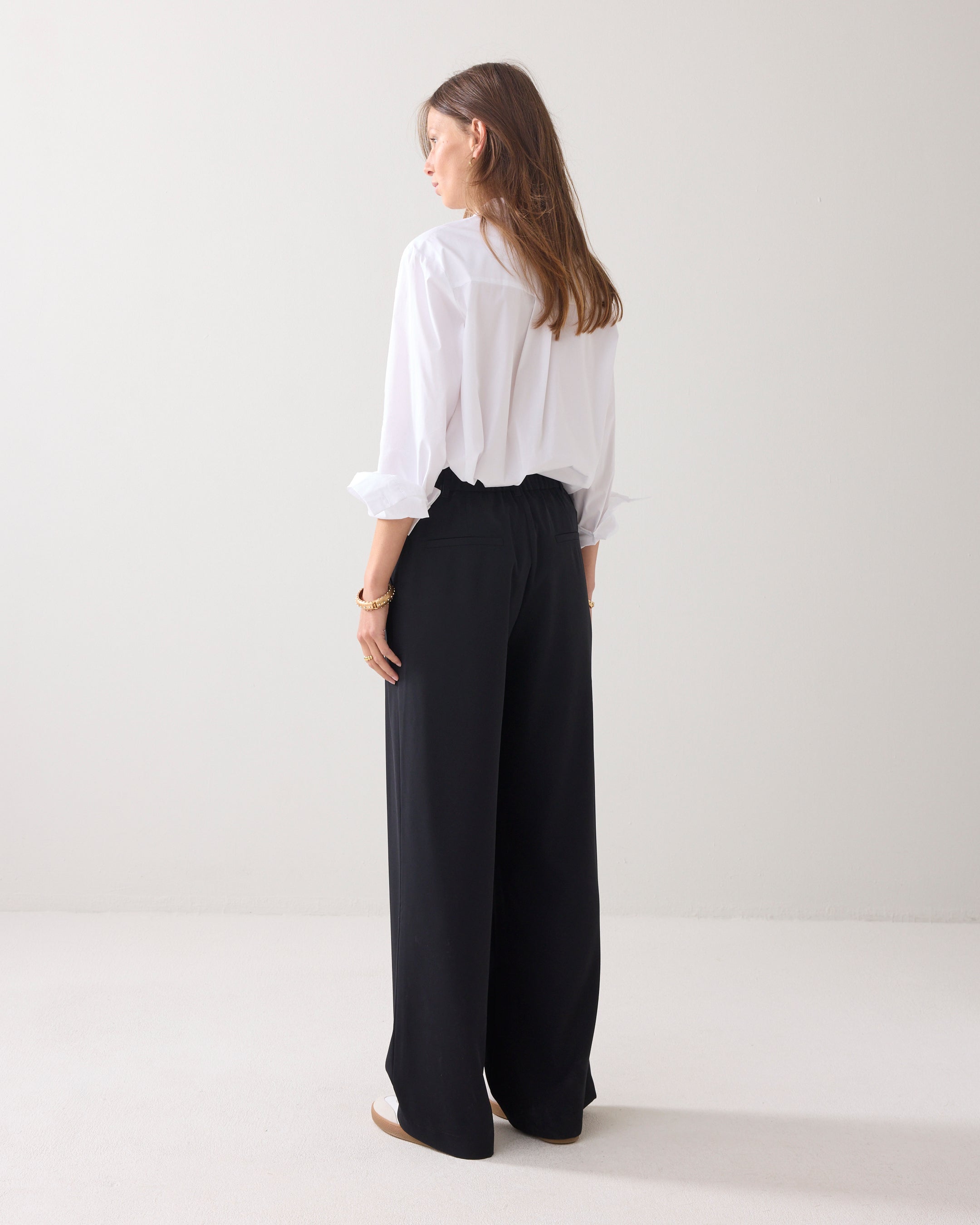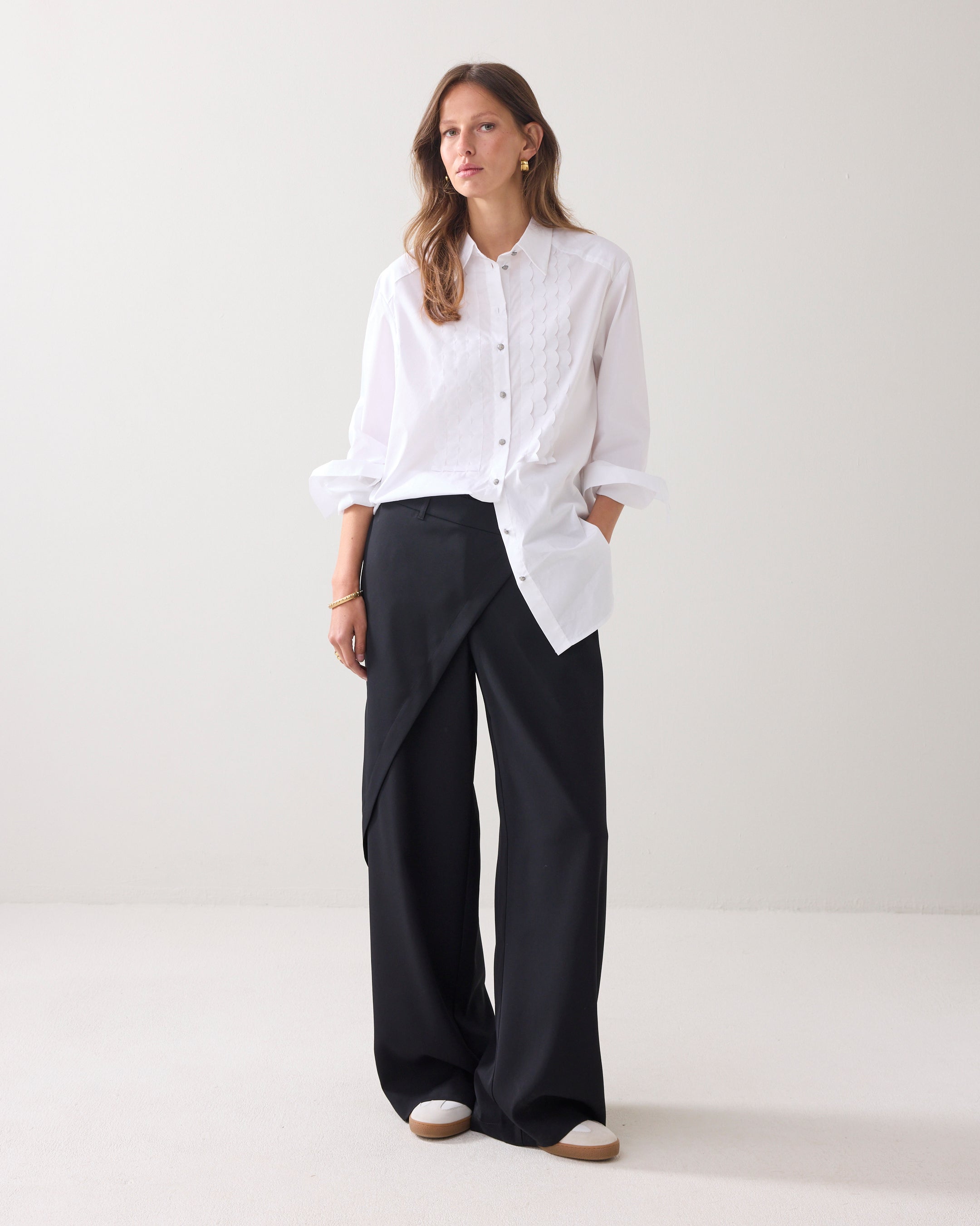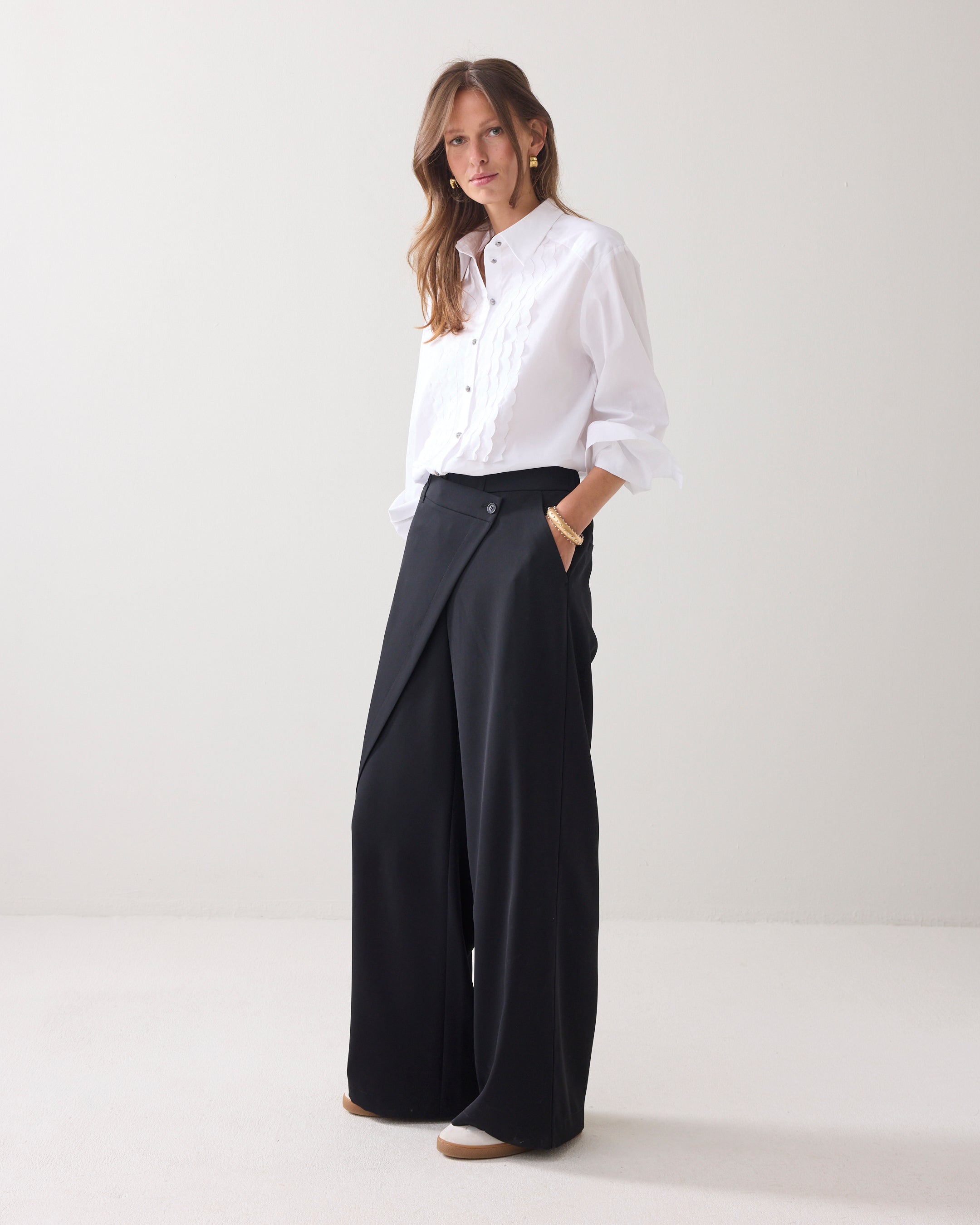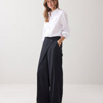 Wijde broek met aan de voorzijde een overslag vanuit de zijnaad. De broek heeft een gladde tailleband voor en een elastische achter. Op de achterkant zitten strookzakken.