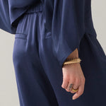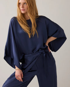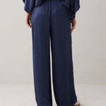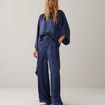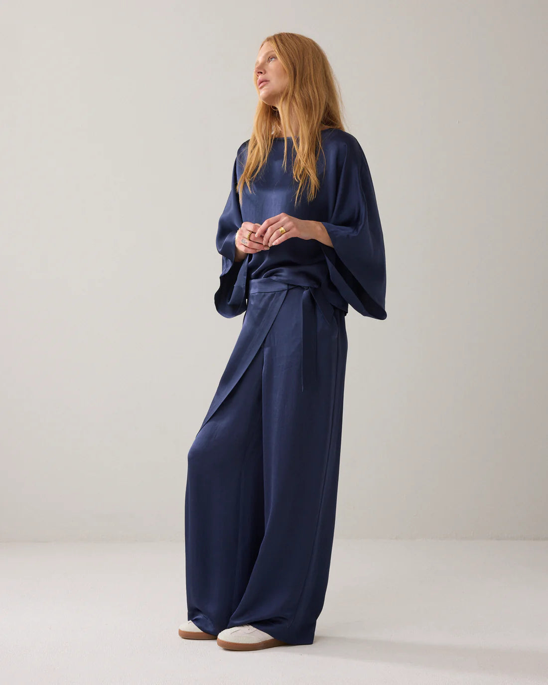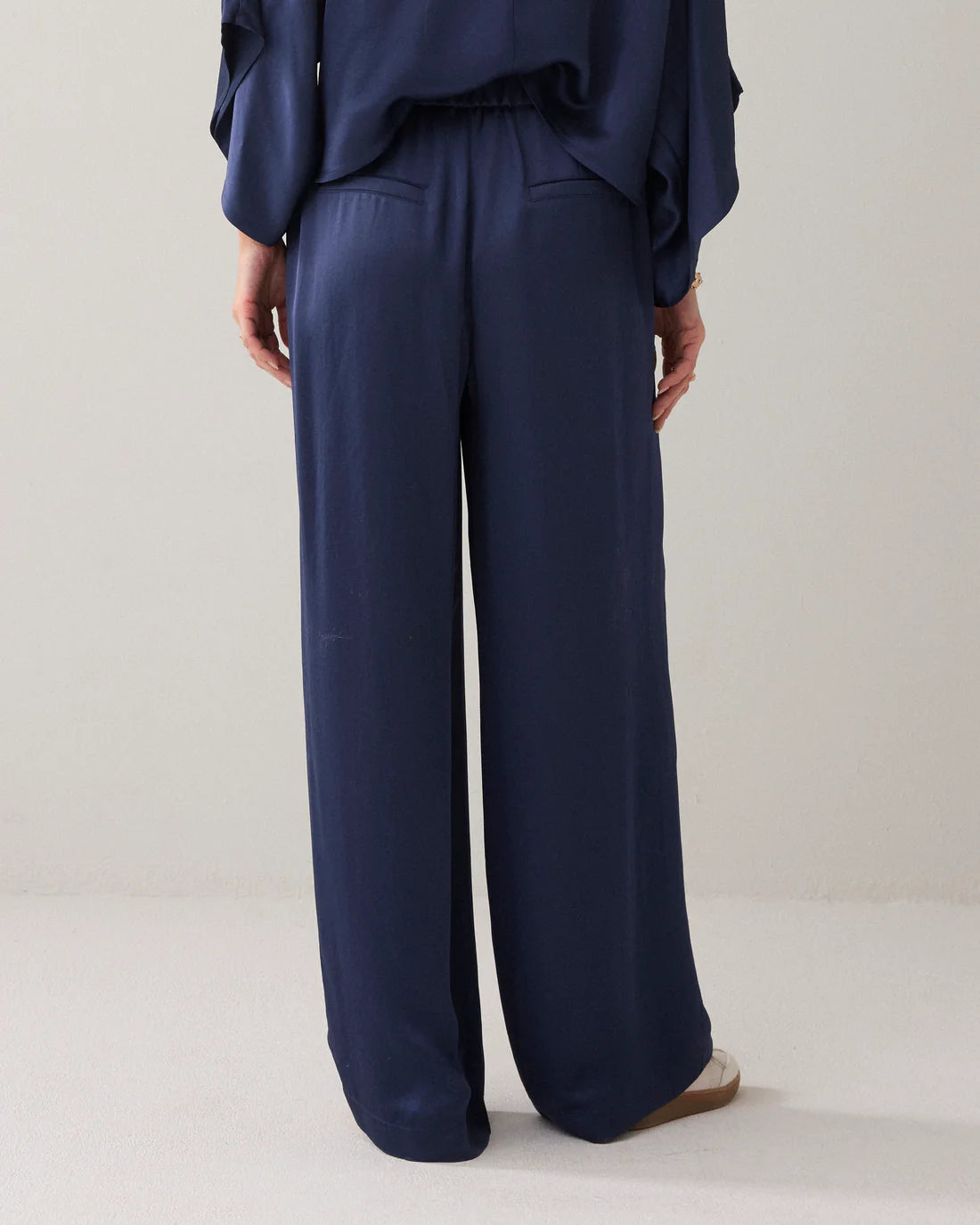 Wijde broek van heavy silk-kwaliteit met aan de voorzijde een overslag vanuit de zijnaad. De broek heeft een gladde tailleband voor en een elastische achter. Op de achterkant zitten strookzakken. Model is 177cm en draagt maat 36.