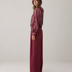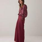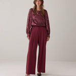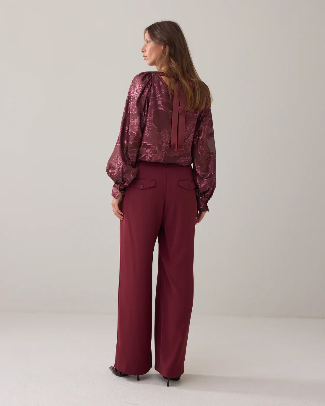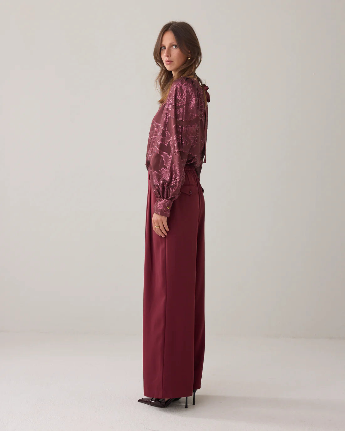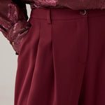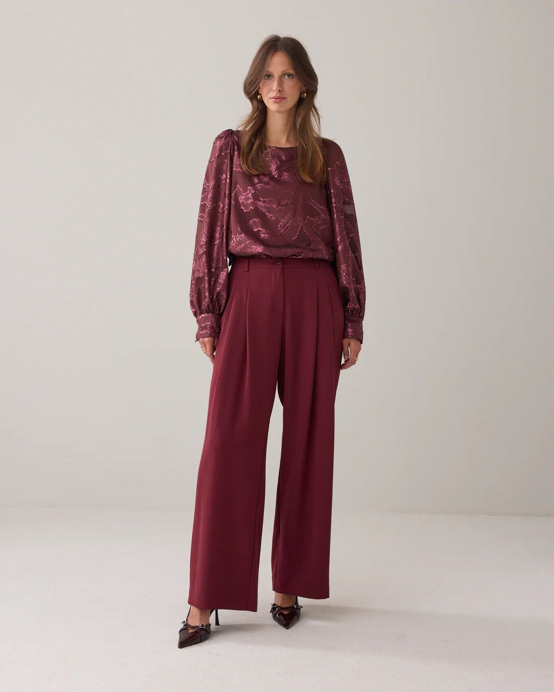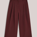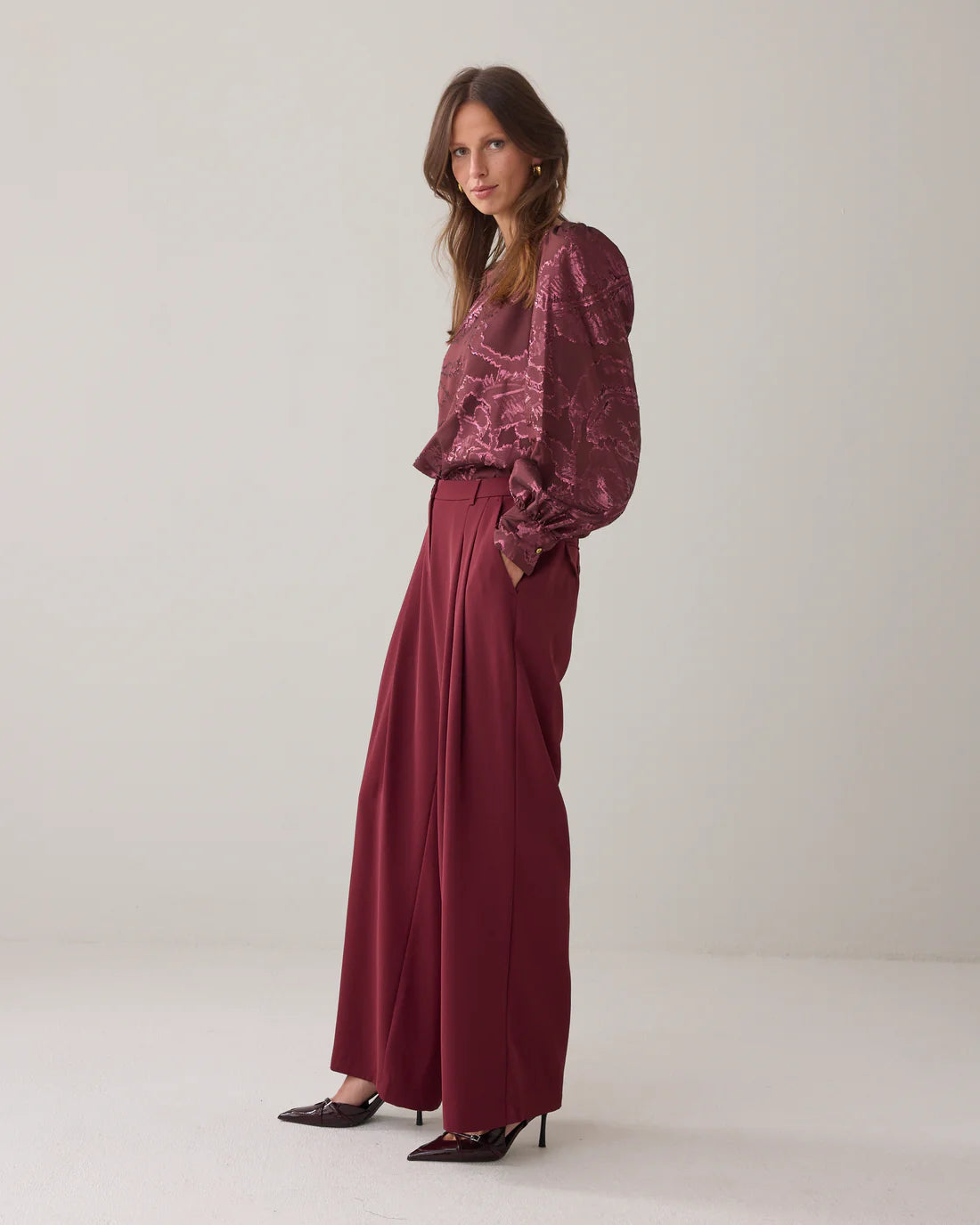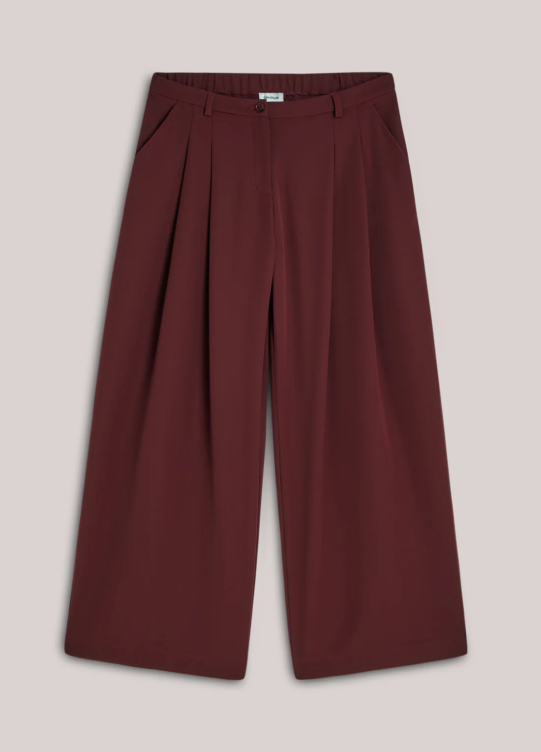 Broek in een soepelvallende fluid kwaliteit met brede stolpplooien en ultra wijde pijpen voor een luchtige uitstraling. De broek heeft een middelhoge taille, steekzakken en valt net boven de enkel.