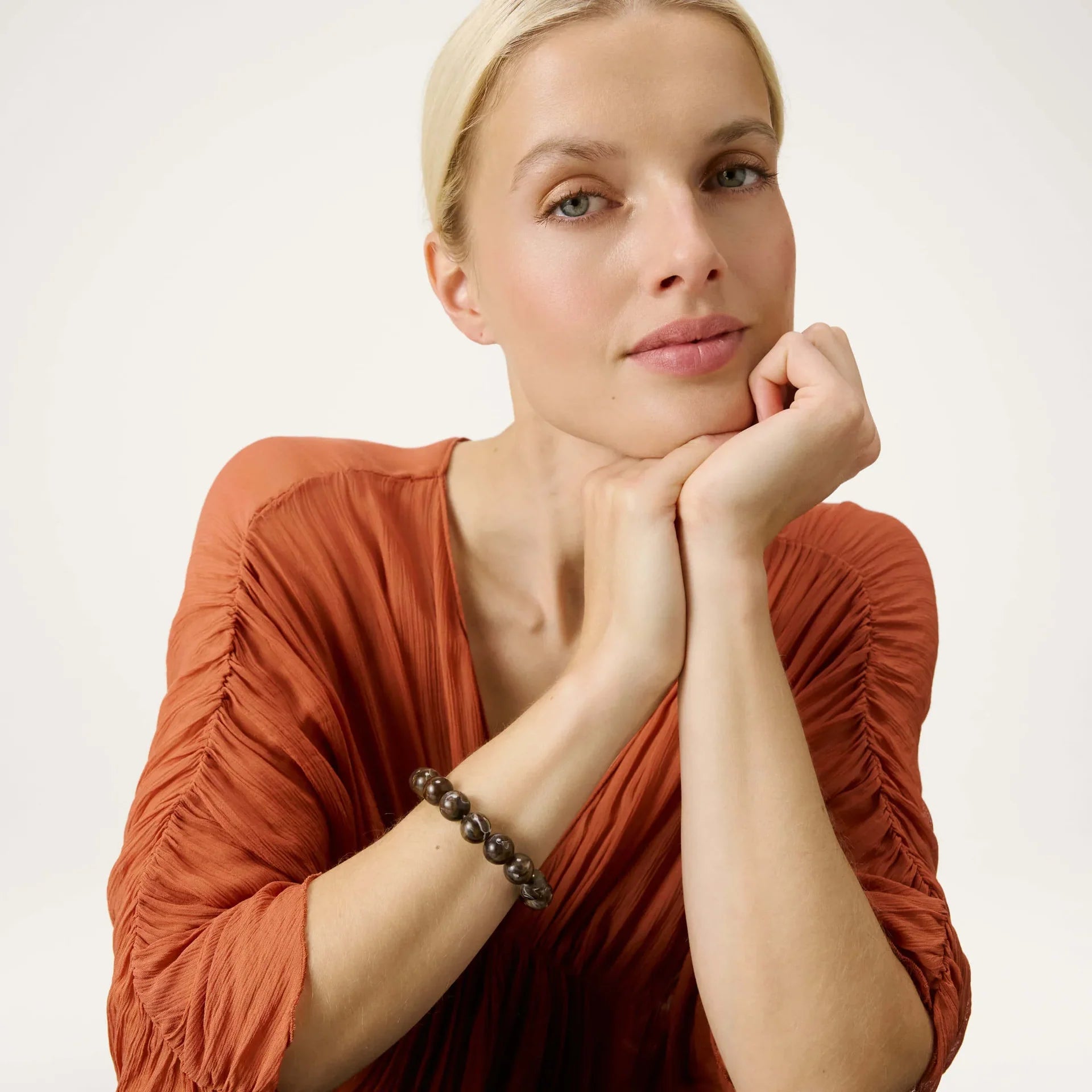 De armband van Vanessa Baroni is een elegante toevoeging aan elke outfit. Dankzij het elastiek sluit het armbandje comfortabel aan om je pols. De prachtige donkerbruine kralen kunnen heel subtiel gedragen worden, of als eyecatcher. Ideaal voor dagelijks gebruik en ook prachtig om cadeau te geven.