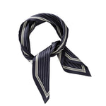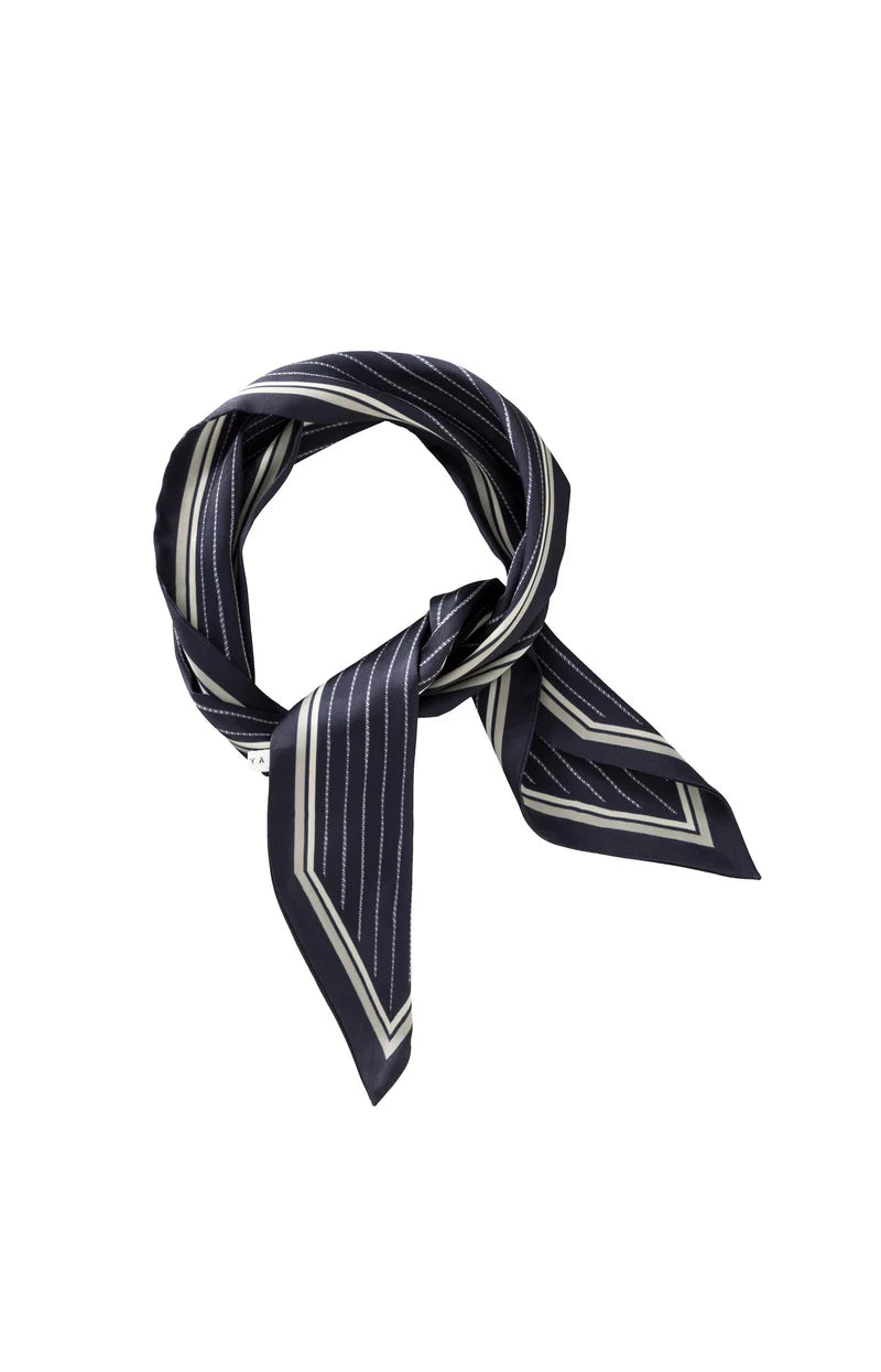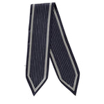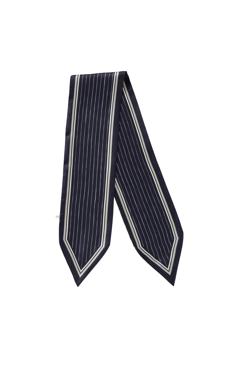 Dit elegante sjaaltje is gemaakt van een soepelvallende stof met een subtiele glans. Het dessin bestaat uit fijne witte strepen op een diepblauwe ondergrond, omlijst met een contrasterende rand. Dankzij het smalle, langwerpige model draag je dit accessoire moeiteloos rond je hals, in je haar of aan een tas.