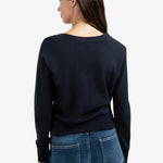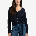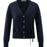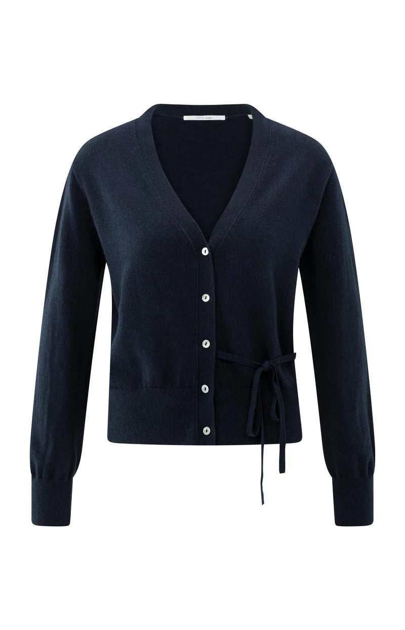 Dit fijne vest is gemaakt van een zachte gebreide stof en is afgewerkt met een diepe V-hals, knoopsluiting en een elegant strikdetail in de taille. De lange mouwen en ribboorden zorgen voor een comfortabele, normale pasvorm. Een veelzijdig item dat je zowel casual als gekleed kan dragen.