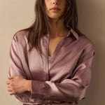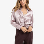 Deze cropped blouse is gemaakt van een glanzende satijnachtige stof en heeft een elegante drapering aan de voorzijde. De elastische band in de taille zorgt voor een blousend effect en extra comfort. Afgewerkt met een klassieke kraag, lange mouwen en manchetten. Een vrouwelijke en eigentijdse toevoeging aan je garderobe. Het model is 178 cm en draagt maat 36.
