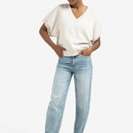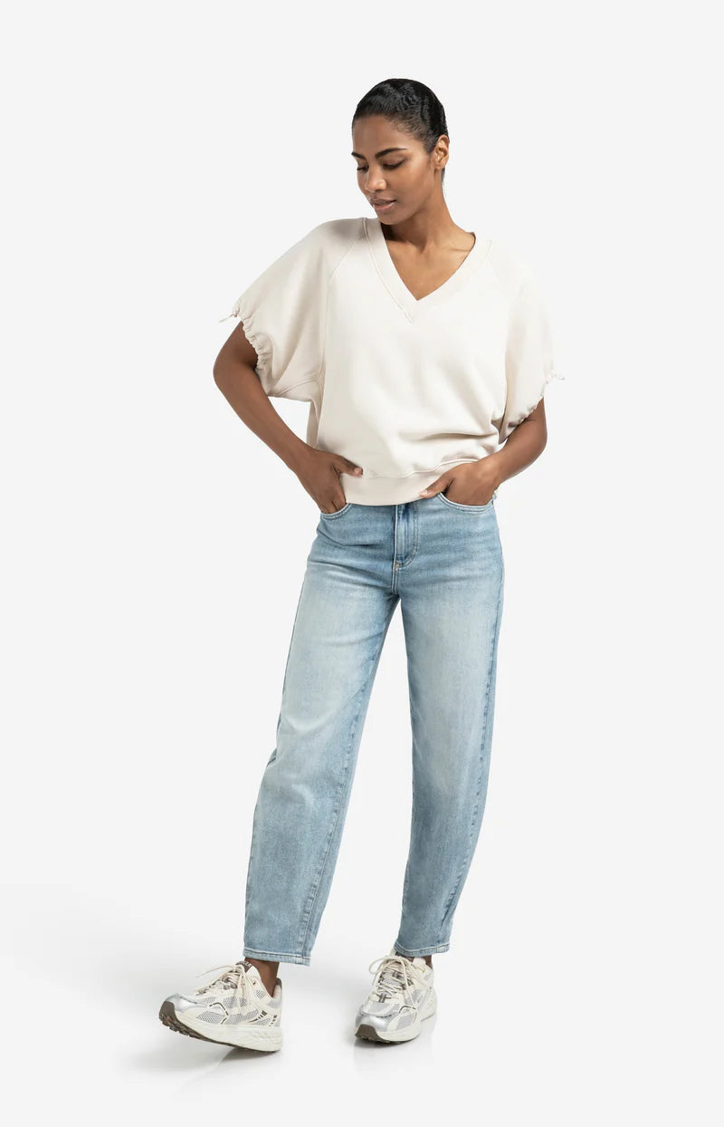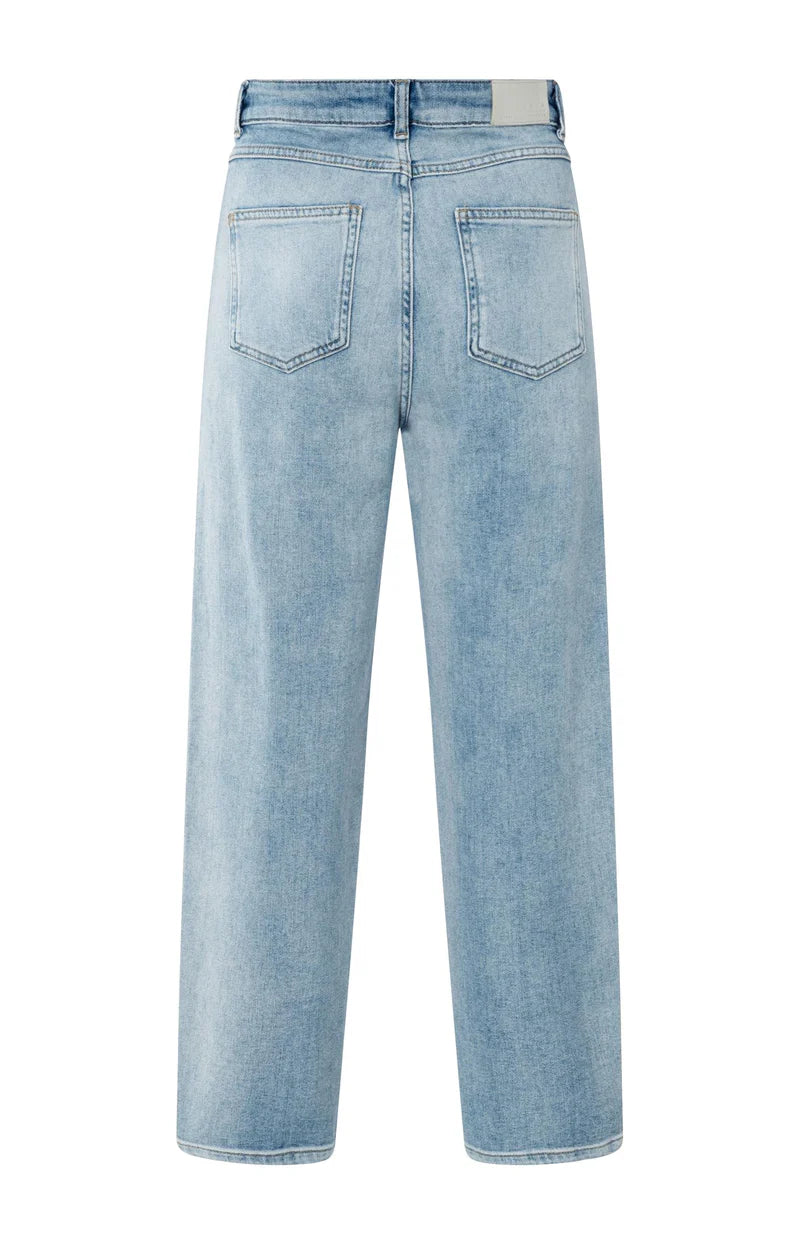 Deze casual jeans is uitgevoerd in een zachte denimkwaliteit en heeft een hoge taille met een losse pasvorm. De broek valt soepel rond de heupen en heeft rechte, iets toelopende pijpen. Voorzien van een klassieke vijfzakkenstijl en een lichte wassing voor een tijdloze uitstraling.