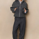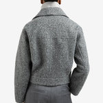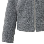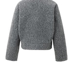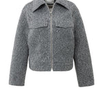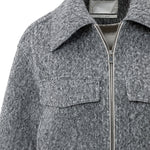Deze korte jas is gemaakt van een zachte bouclé stof en heeft een losse pasvorm. De jas is voorzien van een opstaande kraag met ribgebreid detail, een ritssluiting en klepzakken op de borst. De grove structuur geeft een rijke textuur en een nonchalante uitstraling. Perfect voor een warme en eigentijdse look.