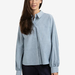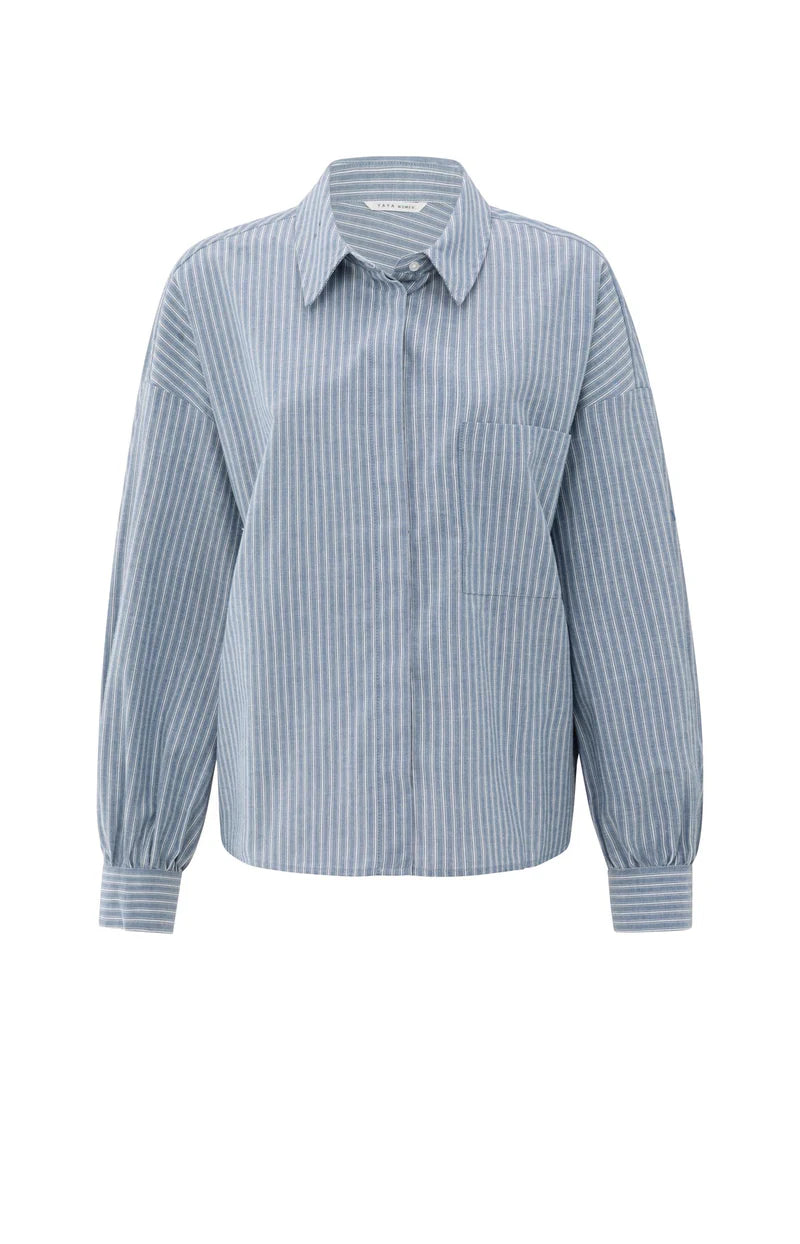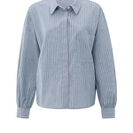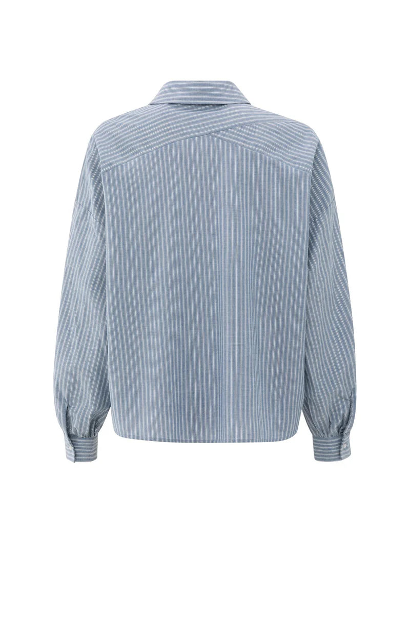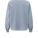 Deze luchtige blouse is voorzien van een klassieke kraag, lange mouwen met manchetten en een oversized pasvorm. De fijne verticale strepen worden op de rug speels onderbroken door een schuin geplaatst schouderstuk. De borstzak en heuplengte geven een casual uitstraling. Perfect voor een stijlvolle, ontspannen look.
