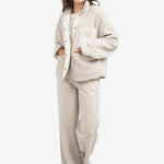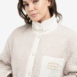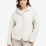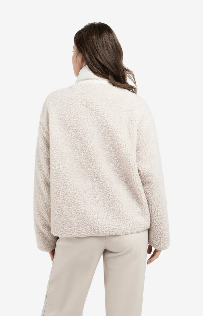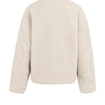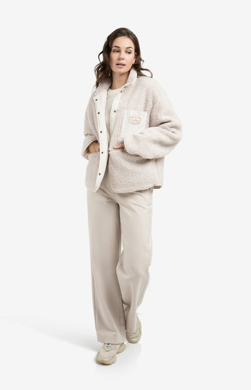 Dit omkeerbare teddy jack combineert comfort en stijl met een zachte teddy buitenzijde en een gladde binnenzijde met nylon accenten. Het jack is voorzien van een opstaande kraag, drukknoopsluiting, lange mouwen en een opvallend borstzakje met tekst. Dankzij de normale pasvorm en de dubbele draagoptie is dit een veelzijdig en eigentijds item voor het tussenseizoen. Het model is 178 cm en draagt maat 36.