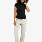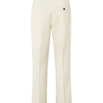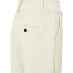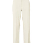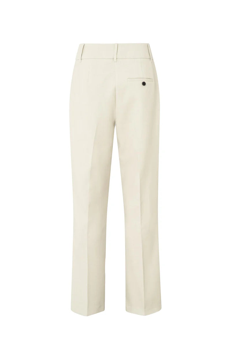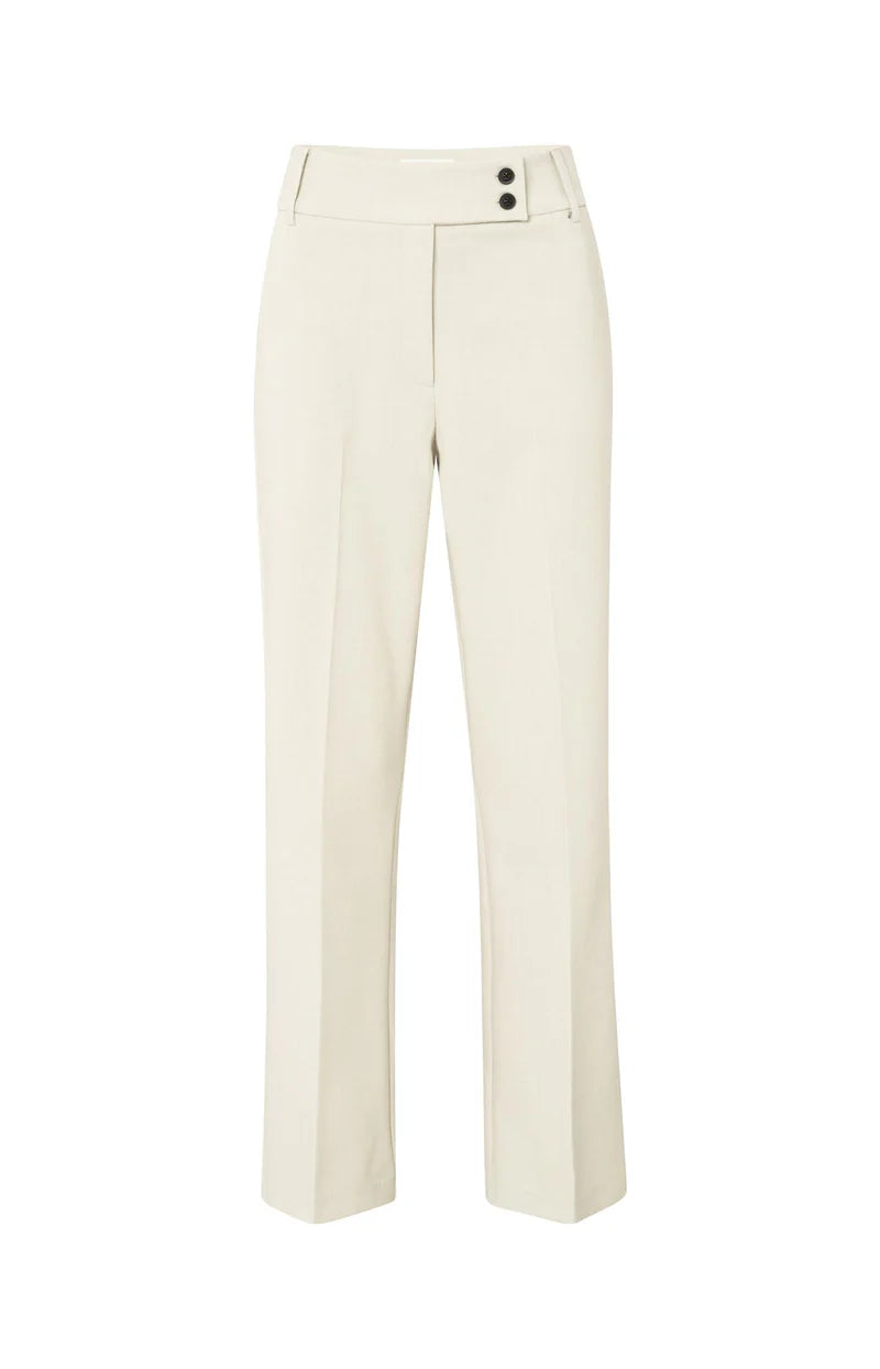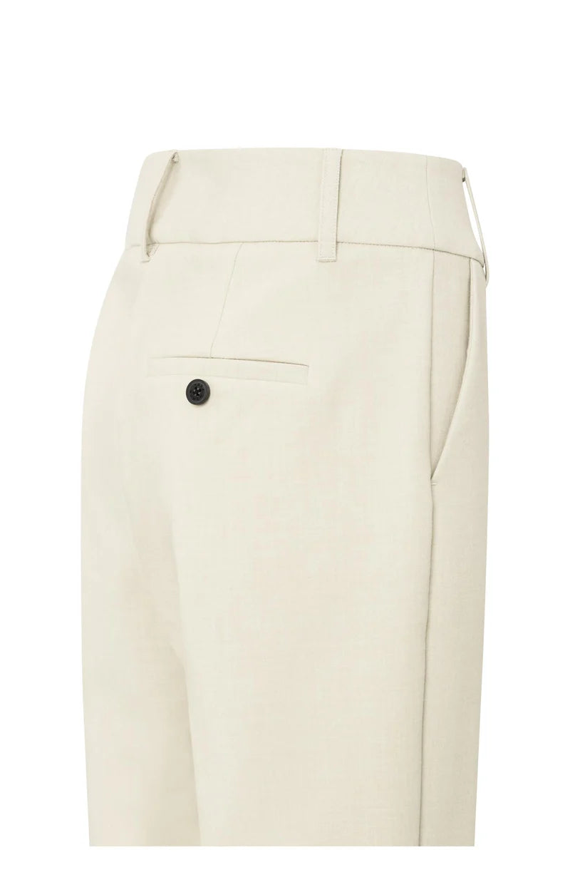 Deze elegante broek is gemaakt van een luchtige, geweven stof en heeft een rechte pasvorm met een stijlvolle, dubbele knoopsluiting op de tailleband. De hoge taille en persvouwen zorgen voor een flatterend silhouet. Voorzien van steekzakken en een achterzak met knoopdetail. Perfect voor een verzorgde, casual of zakelijke look. Het model is 173 cm en draagt maat 36.