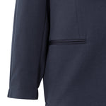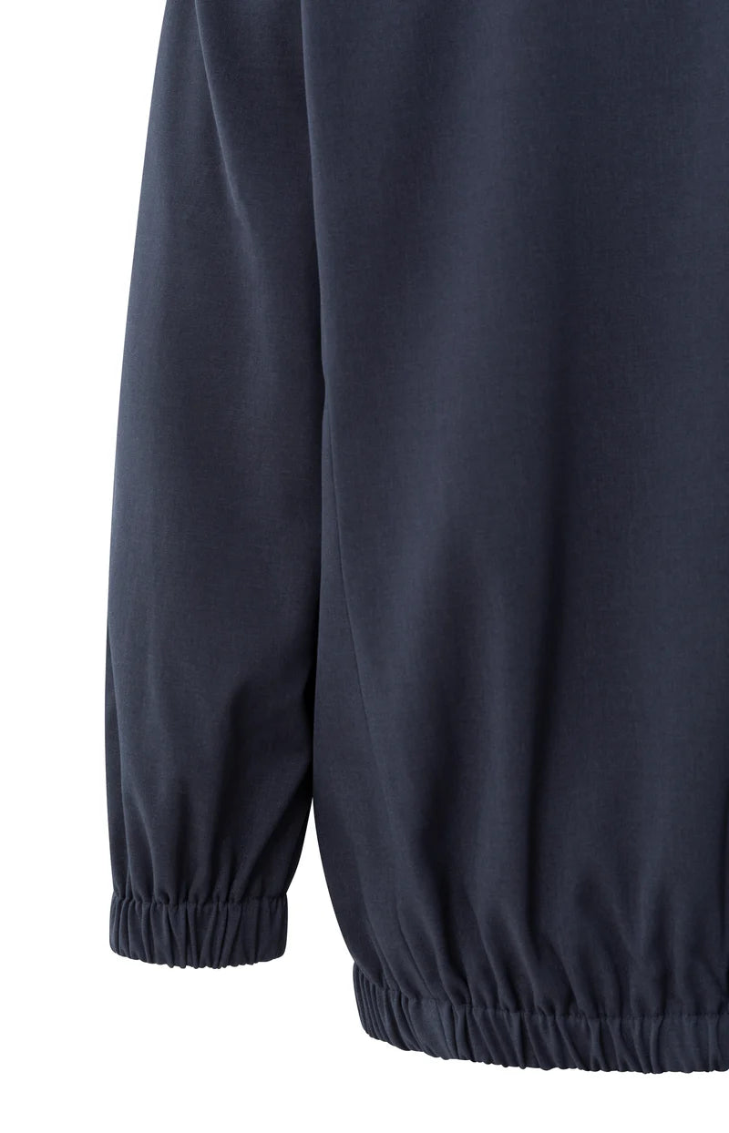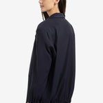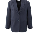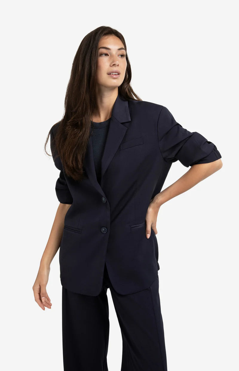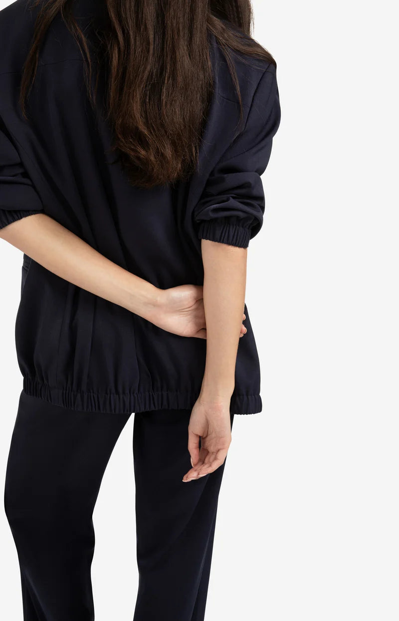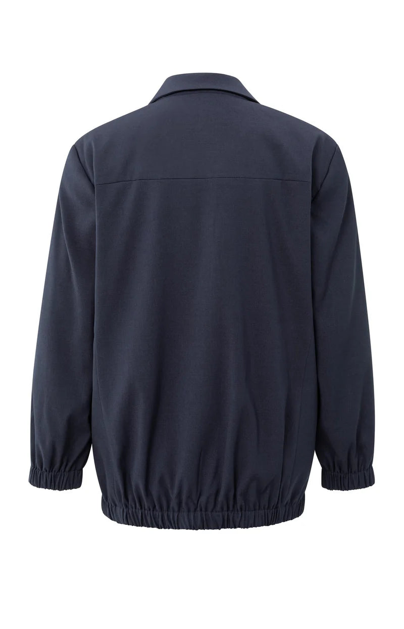 Deze elegante blazer heeft een rechte, losvallende pasvorm met klassieke revers en een dubbele knoopsluiting. De zoom is afgerond en licht elastisch, met een iets langere achterkant subtiele details die doen denken aan een bomberjack. Afgewerkt met paspelzakken en lange mouwen. Een perfecte mix van klassiek en sportief.