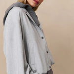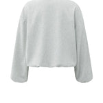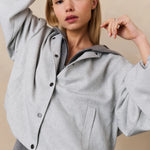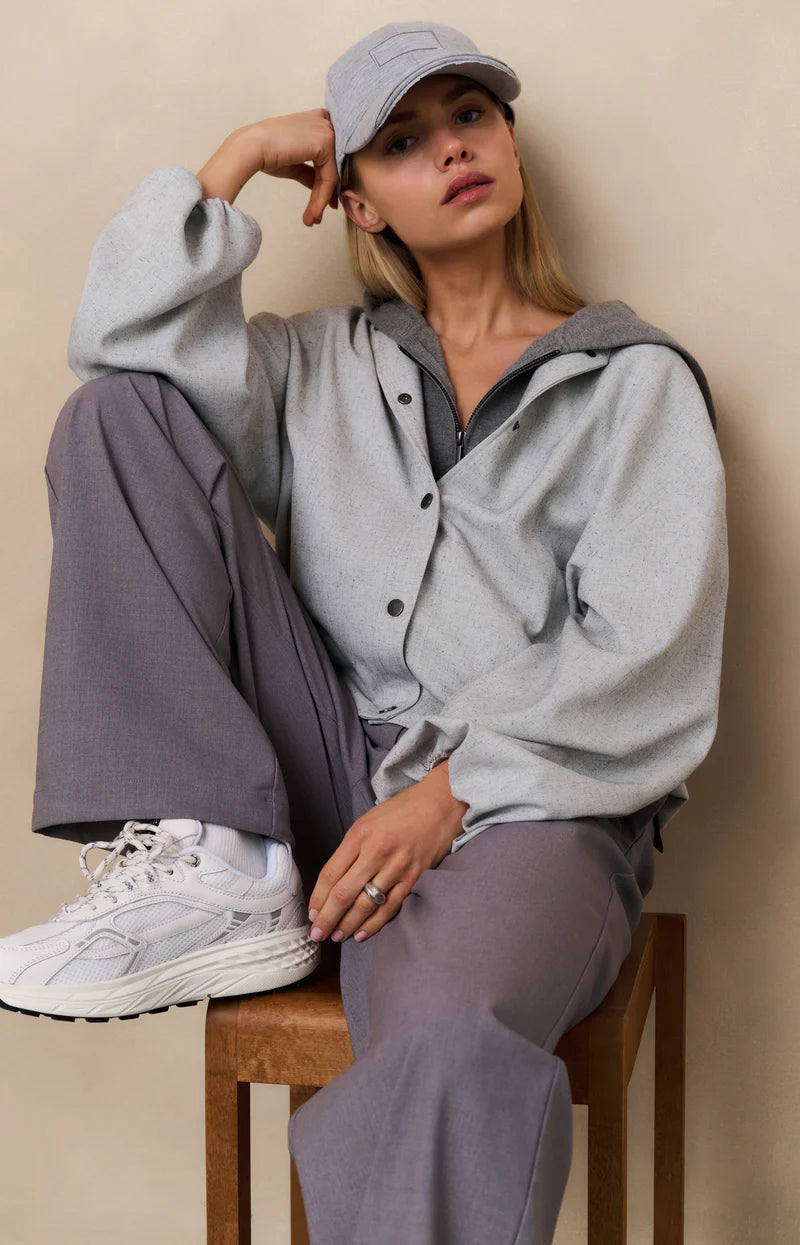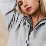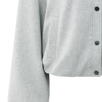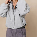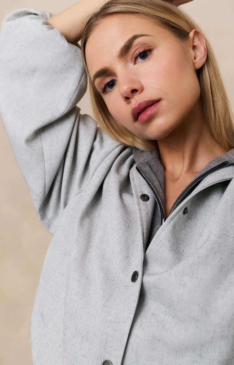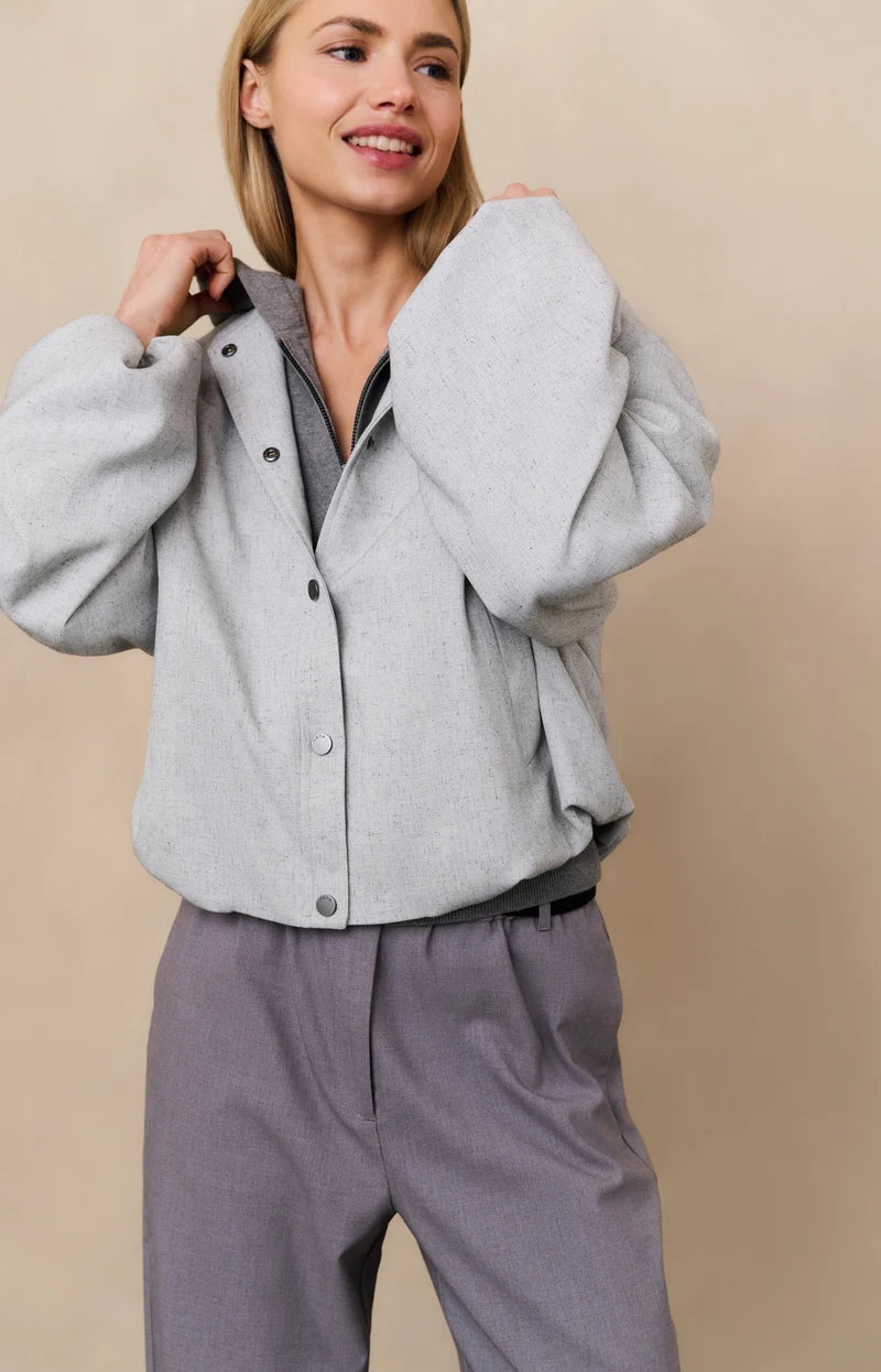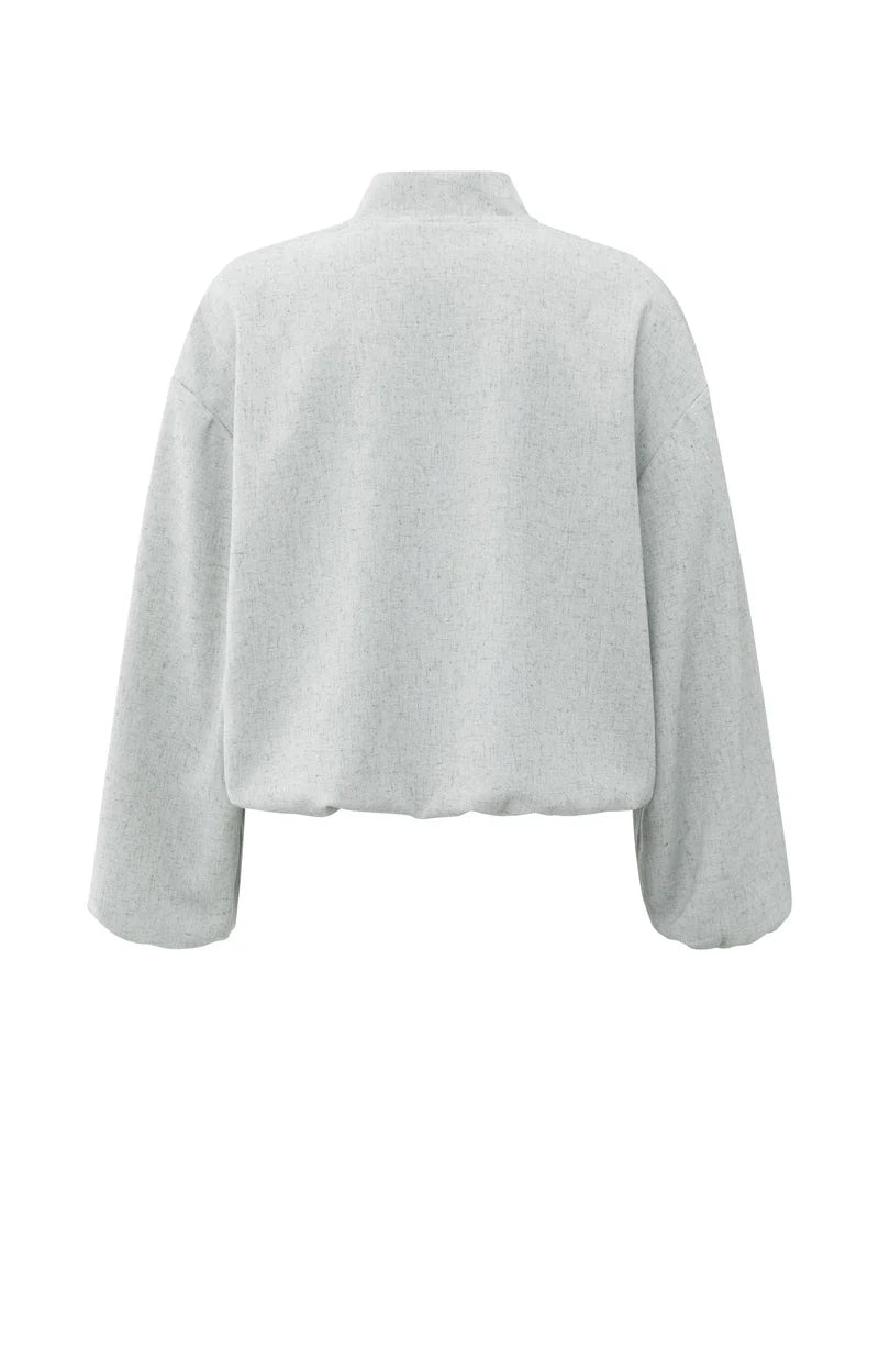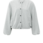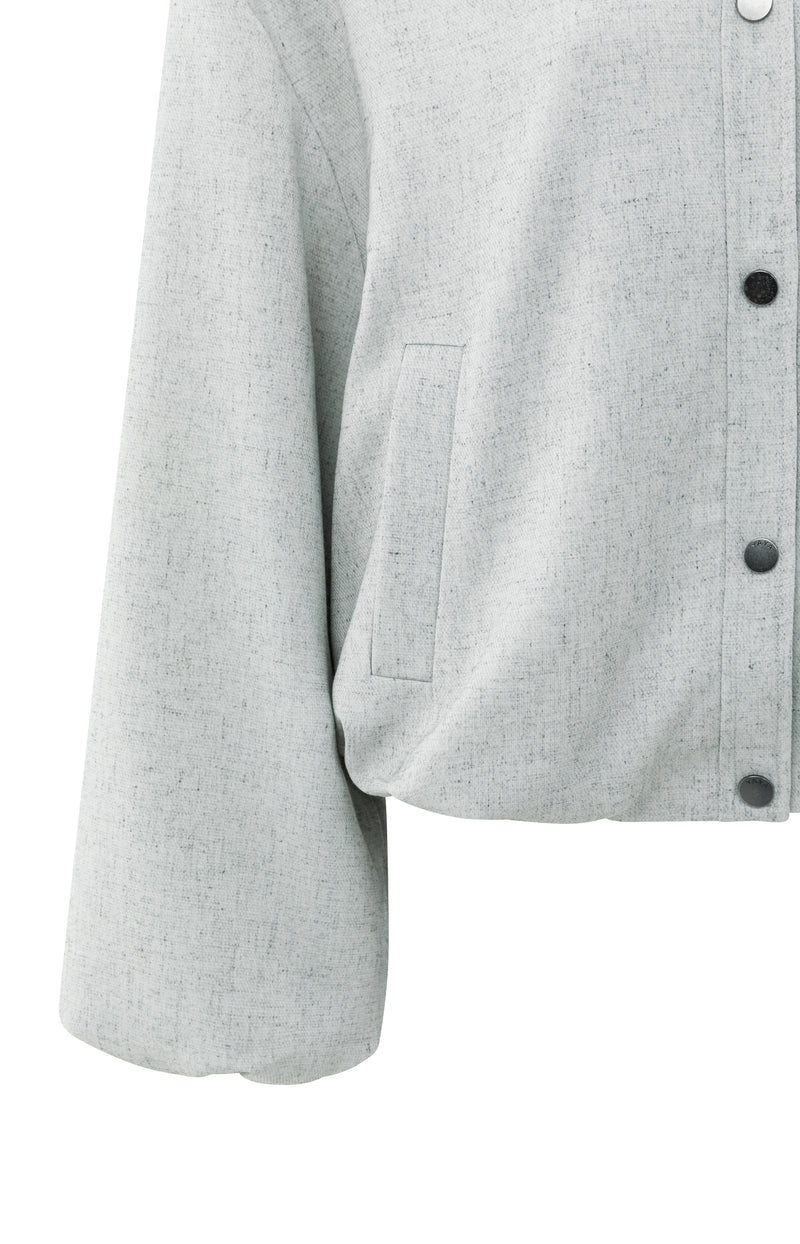 Dit comfortabele jasje is ontworpen met een subtiel ballonvormig silhouet dat wordt geaccentueerd door de elastische zoom. Het heeft een opstaande kraag, verlaagde schoudernaden, lange mouwen en een sluiting met matte drukknopen. De zachte geweven stof en minimalistische uitstraling maken het perfect voor een moderne, casual look.