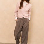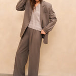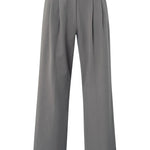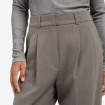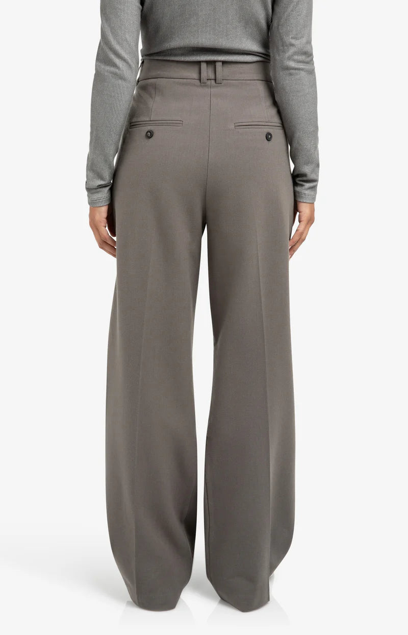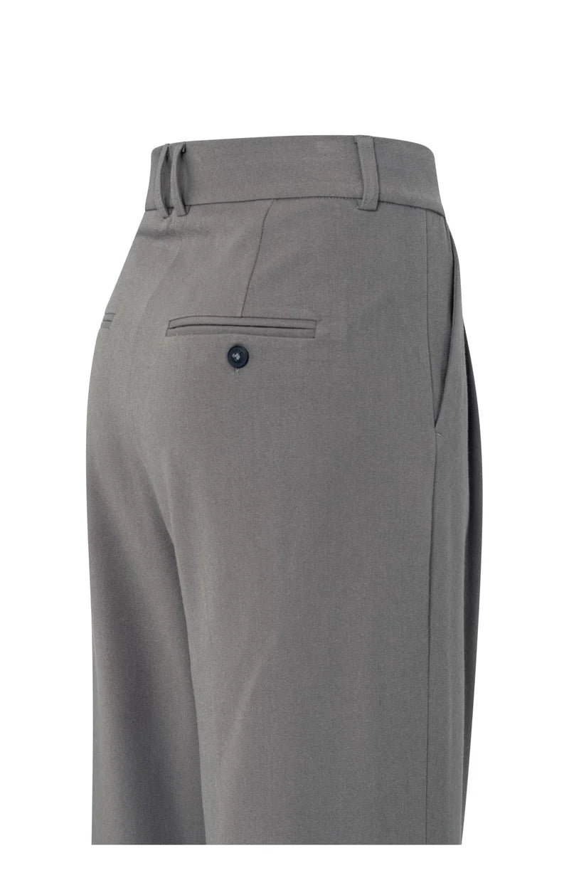 Deze elegante broek is gemaakt van een zachte geweven stof en heeft een hoge taille, wijde pijpen en vrouwelijke plooidetails aan de voorzijde. De pasvorm is comfortabel en stijlvol, perfect voor zowel een casual als zakelijke look. Afgewerkt met steekzakken en paspelzakken achter. Het model is 173 cm en draagt maat 36.